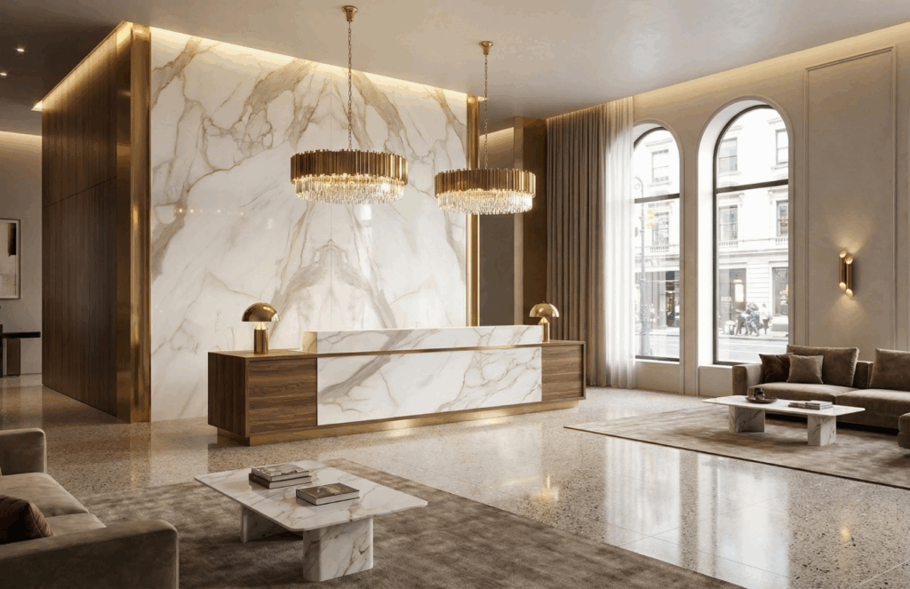 Porcelain stoneware collections featuring stone, wood, marble, cement and chromatic effects. Innovative technologies include ZERO.3 thin slabs, THINk ZERO carbon neutral surfaces and PROTECT® antibacterial treatment, offering versatile solutions for both interior and exterior applications.